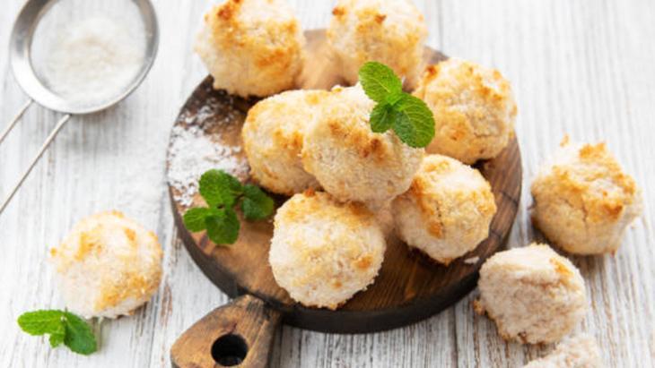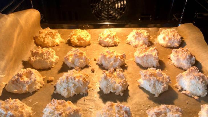 Fırınınızı 175 dereceye ayarladıktan sonra o ısınana kadar bir kâsede yumurta beyazı, şeker ve tuzu mikserle yaklaşık 2 ila 3 dakika çırpın. Ardından, Hindistan cevizi rendesini ekleyin ve tüm malzemeleri iyice karıştırın.