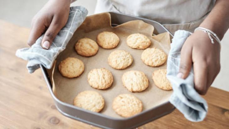 Fırın tepsisini yağlı kâğıtla kapladıktan sonra hazırladığınız karışımı, iki kaşık yardımıyla yağlı kâğıdın üzerine aralıklı olarak yerleştirin. 20 dakika boyunca, kurabiyeler altın rengi alana kadar pişirmelisiniz. Afiyet olsun!