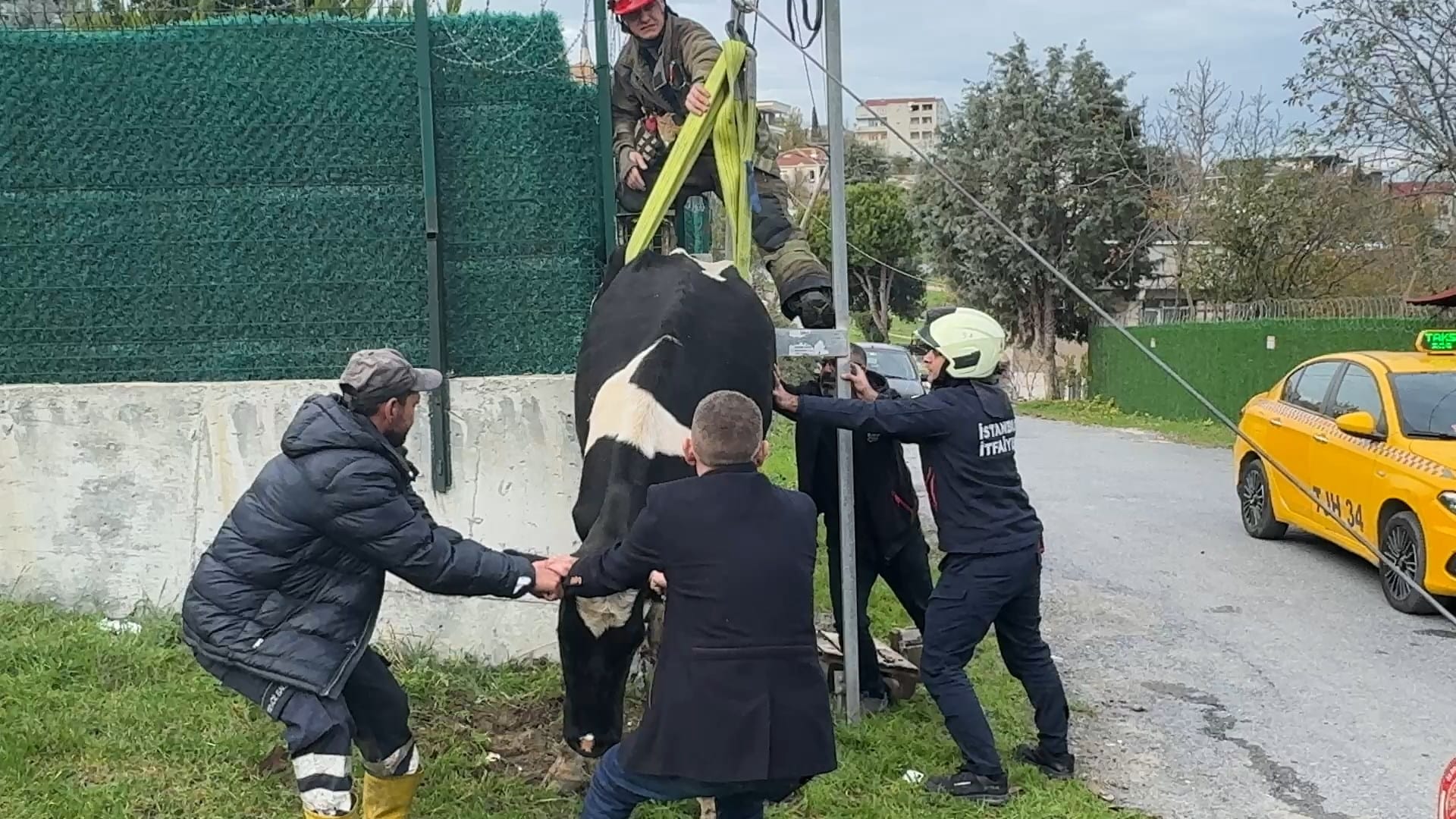 İhbar üzerine olay yerine itfaiye ekipleri sevk edildi. İtfaiye personeli, sıkışmanın elektrik direği dibinde olması nedeniyle güvenlik önlemi olarak elektrik dağıtım şirketi ekiplerini de bölgeye çağırdı. Ekipler ve hayvan sahibi tarafından yapılan değerlendirme sonucunda, ineğin halatlarla bağlanarak yukarı çekilmesine karar verildi.